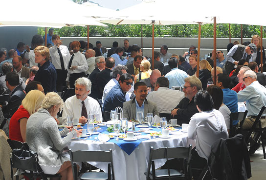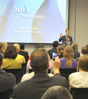 In his address to the crowd, Mayor Garcetti said, “Emerson College Los Angeles is both a landmark of artistic achievement and a flagship accomplishment for the revitalization of a neighborhood that has seen decline. This is now a jewel in the crown of the Hollywood Renaissance.” Garcetti said the project, which employed as many as a hundred union workers a day, was a shot in the arm in the form of good, middle-class jobs.” Ron Miller, Executive Secretary for the Los Angeles/Orange Counties Building Trades Council, said the project’s first win was securing approval to break ground. “This is a dramatic building, and I gotta tell ya, we had some drama getting it to this point. But we put together a strong coalition, and proved there’s no stopping a project that’s good for the community.” Established in 1880, Emerson College evolved from a small New England school of oratory to a multifaceted college with an international reputation. The new Los Angeles (Hollywood) campus now offers students television, film, journalism, marketing, and communication internships, which assist in their networking base. These opportunities were available to students as early as January 2014. During his speech, Founding Director Kevin Bright said, “We imagined a campus inside a building, one that would provide Hollywood and Los Angeles with a gift of an iconic landmark. It will bring jobs, prosperity and a new opinion of Hollywood. And, I’m proud to say, it’s union-made.” Hathaway Dinwiddie Senior Project Manager Bruce Arnold said, “Without unions, we wouldn’t be successful. I’ve been at it 30 years and can’t recall a time they didn’t supply as much highly skilled labor as we needed to complete our projects on time and with the highest level of quality. We are pleased to have a PLA too—You hit the schedule, you get the quality.” Arnold pointed out that construction was 100% accident-free, which those involved say was no small feat, since the highly non-standard building required hefting materials 10 stories above a parcel of land barely larger than its own base. That meant zero margin for error. The construction team immaculately created a sun-shading system connected to a local weather station that automatically adjusts to minimize the energy used to heat, cool and illuminate the glass-enclosed residential towers. A valence system, located within the ceilings, is controlled by sensors and provides radiant heating and cooling for the residential units. On top of the West tower, solar thermal panels use the sun to heat water, providing hot water throughout the center and decreasing the building’s consumption of natural gas. The building is also equipped with efficient fixtures and on-site water management to reduce water use by 40%. “It was potentially quite dangerous,” said Iron Workers Local 433 President and Business Agent Piedmont Brown. “But the Iron Workers had a good engineering plan. It was precarious, but we made it happen.” Brown said that such care paid off in the form of a world-class calling card for what journeymen from the Trades can do. “It’s a great building, it stands out, it’s an icon for Hollywood, something people will slow down and take a look at.” “It is quite a remarkable feat for a structure of this magnitude and design to become LEED Gold Certified,” said AQC’s Chair Pam Ackrich. “Positive results can occur only with a stellar general contractor leading the project, superb architectural design, cooperation between government and Emerson College, and all union trades working in unison. In addition, the safety record on this arduous project is most impressive.” The Emerson College sustainable building is situated on the lively corner of Sunset Boulevard and Gordon Street, with a pristine view of the Hollywood sign. The glitzy building provides 6 general purpose classrooms, a computer lab, an audio lab, a distance learning room, two performance studios, dressing rooms, study rooms, a 4K screening room, a multi-purpose event space, and a post-audio mixing suite. The event space has advanced audio and visual equipment with seating capacity of 250 persons reconfigurable for special events and parties and the post audio is a 7.1 Dolby surround sound audio suite that is shaped to provide optimum acoustics. The outdoor terrace includes a park-like grass area with trees and barbeque grills. This avant-garde “building-within-a-building” turns heads from every direction. Accepting the 2014 Q Award for Emerson College Los Angeles was Lee Pelton, president of Emerson College. On behalf of Emerson College, Mr. Pelton exuberantly remarked, “The building will remain a powerful economic engine now that it’s complete. LA has always understood the value of the creative economy to attract businesses and services, innovation and investment. It’s essential to providing not only jobs, but revenue.” Immediately after the Q Award presentation attendees enjoyed a sumptuous lunch with the quad area surrounded by the angles and precipices of Emerson’s outstanding modern architecture. Once again the Southern California sunshine added to a perfect ambiance. AQC’s Q Award is given annually through a ceremony and event for outstanding contributions toward the attainment of quality construction within the building industry of Southern California. The recipient is selected by the Alliance’s membership from quality union construction projects completed in the previous year. Emerson College Los Angeles is now recognized to be in an elite collection of Southern California structures like the Renée and Henry Segerstrom Concert Hall, Disney Concert Hall, Nokia Theater L.A. Live, Cathedral of the Angels, The Getty Villa, and others. “This is becoming an elite event,” said Pam Ackrich. “Interest in the Q Award grows every year as we recognize the talents and cooperation between labor, management, local government and the facility’s owner