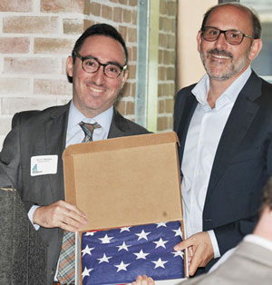 Emcee Barry Garfield introduced Westfield’s Larry Green to a thundering applause from the near 200 guests. Mr. Green proceeded to play two videos shown on screens surrounding the venue. The first video was a high angle time-lapse of the Village at Westfield Topanga from breaking ground through the project’s completion. The second video highlighted the Village along with interviews of delighted patrons of the new shopping development. Thereafter, Los Angeles City Mayor Garcetti’s representative Kevin Taylor presented Mr. Green with a certificate of appreciation. Scott Abrams from Congressman Sherman’s office presented Green with an American flag flown over the U.S. Capitol.