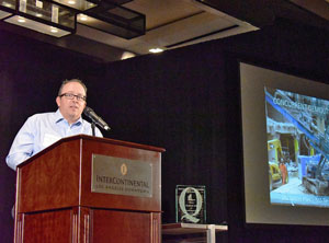 General contractor representative and project manager, Senior Vice President of Turner Construction Brendan Murphy, took to the podium to present a fascinating recollection of the construction of the Wilshire Grand Center. Mr. Murphy expressed the challenge of planning and construction within a city block without disrupting or damaging the perimeter of streets, utilities and subway routes. He showed a time-lapse video of demolition of the previous hotel through to the construction and completion of the Wilshire Grand Center. Murphy gave accolades to the sub contractors and their union work force.
