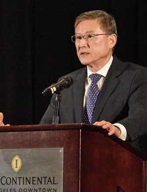 Chris Park, Senior Vice President of Hanjin International, a Cho Korean Air subsidiary, was presented and accepted the award for property owner Korean Air from AQC Chair Pam Ackrich. Pam Ackrich read the engraved wording on the award, “Alliance for Quality Construction 2018 Q Award honoring Korean Air and its Wilshire Grand Center for their outstanding contribution toward the attainment of quality construction within the building industry of Southern California.” Mr. Park graciously accepted the award and then spoke about his history with the company. He was a manager at the previously demolished hotel until the owner Mr. Cho offered him a job with the new development. Mr. Park said, “This has been a challenging project and I am proud to be a part of. There were many details along the way of which I would discuss with owner Mr. Cho.” He thanked the Alliance for Quality Construction for the honor, and recognized the incredible work by the union contractors and labor.